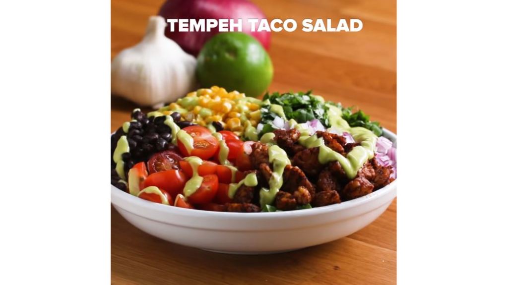 The tempeh taco salad is a timeless recipe! For the salad, you will need 8 ounces of tempeh, some oil, 3 tablespoons of soy sauce, 2 teaspoons of garlic powder, 2 teaspoons of chili powder, 1 teaspoon of cumin, lettuce, tomatoes, black beans, corn, cilantro, red onion. (For the salad dressing, you will need one avocado, the juice of one lime, 1/4 cup olive oil, salt, pepper, and 3 to 6 tablespoons of water.) See the slideshow below: